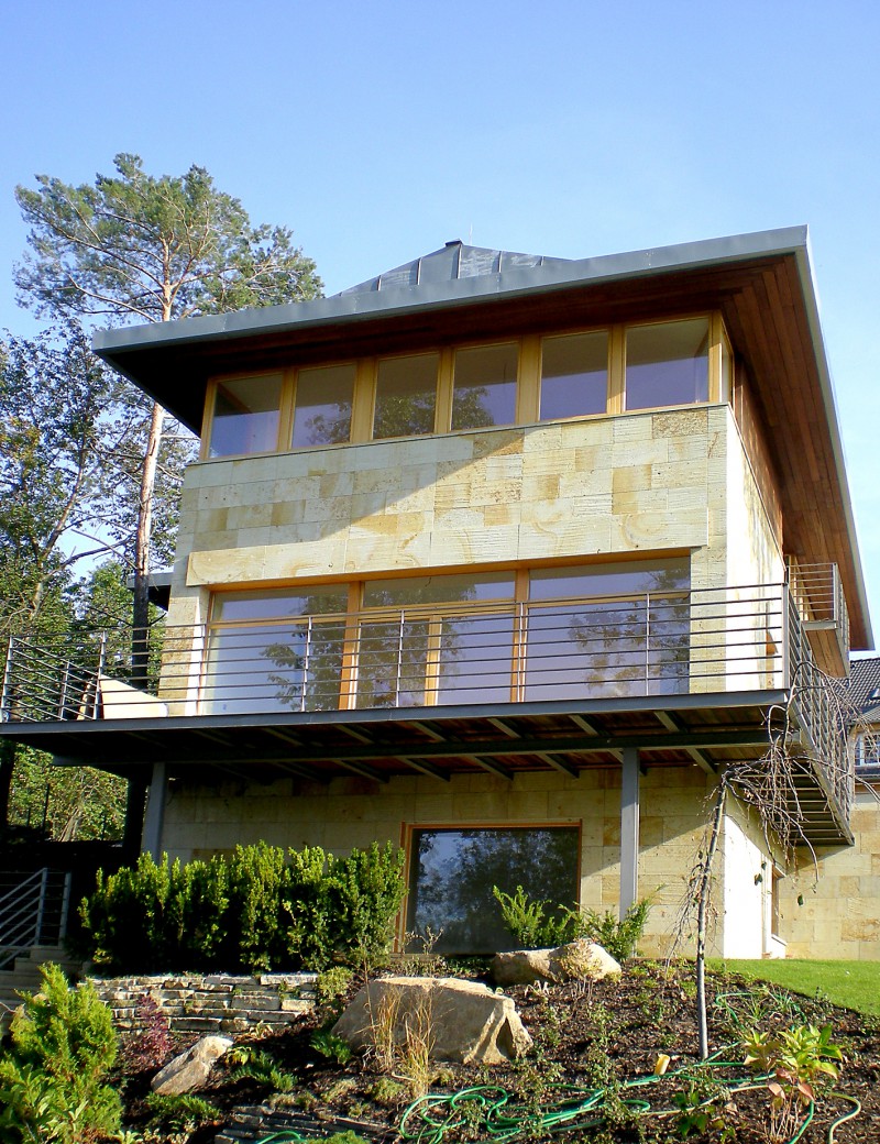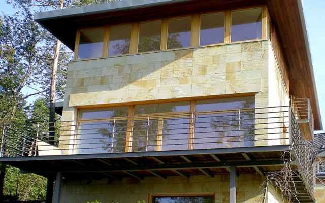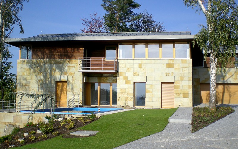 Vila s pískovcovým obkladem, jednoduchou a prosotrnou dispozí